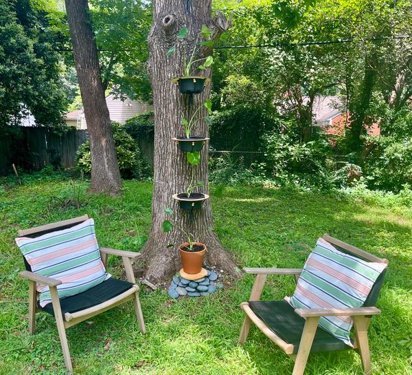 Hanging tiered planter with colorful flowers on a wooden deck overlooking a green garden.